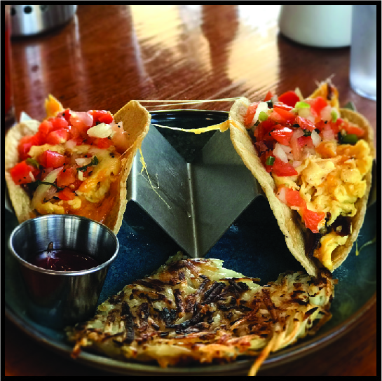 Two corn tortillas filled with scrambled eggs, chorizo, cheddar cheese, and tater tots topped with onions and cilantro. Served with two house made salsas.